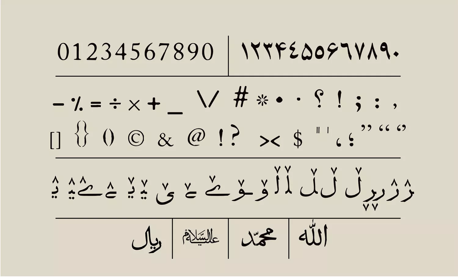 With the inclusion of diacritics and certain special ligatures, the Daftar Font is capable of supporting texts written in the Arabic language.
