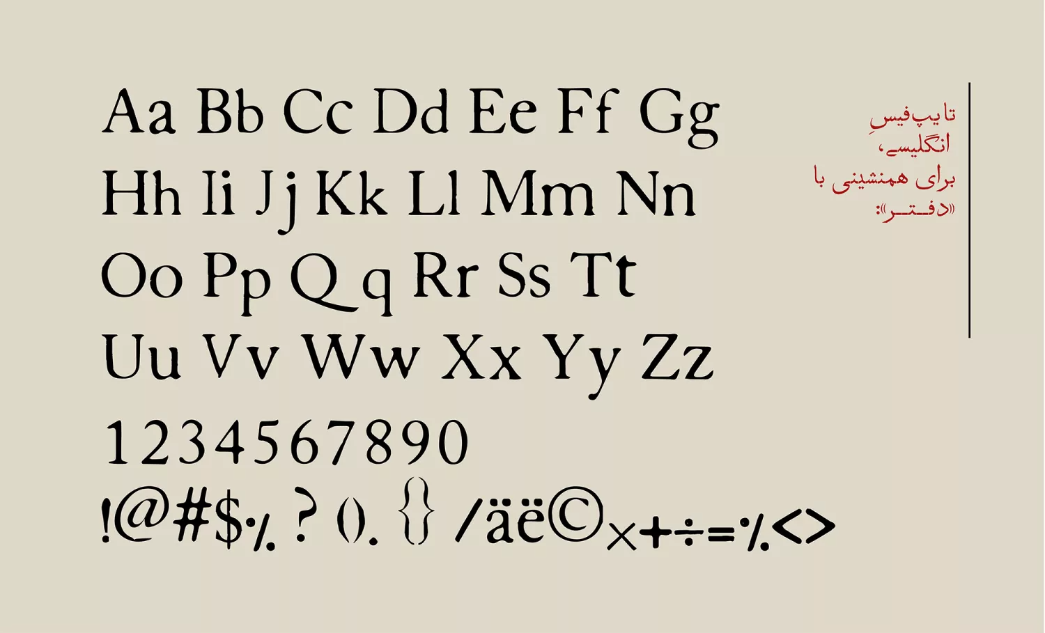 The English typeface chosen to accompany Daftar has been carefully modified, through the addition of texture, erosion, and adjustments in form, to closely resemble its Persian counterpart. This ensures that in bilingual texts, both scripts share a consistent tone and visual harmony.